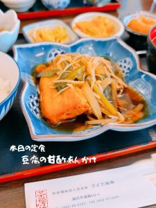 本日の定食は豆腐の甘酢あんかけ。